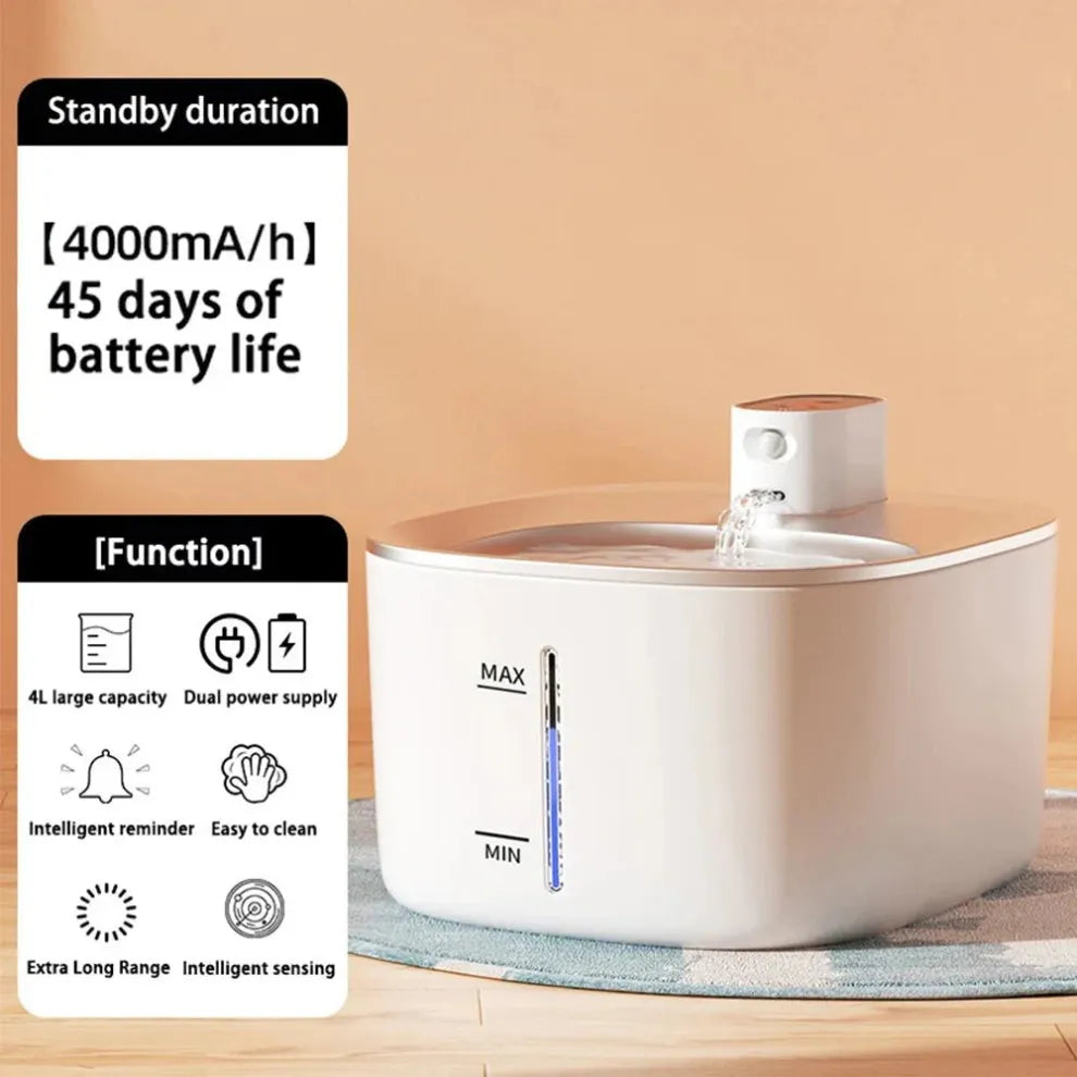 Deze draadloze waterfontein met een capaciteit van 4 liter is ontworpen om uw huisdier te stimuleren meer water te drinken. Dankzij de stilstaande werking en de bewegingssensor is deze fontein ideaal voor zowel katten als honden. Het hoogwaardige materiaal en het gebruiksgemak maken het een uitstekende keuze voor elke huisdiereigenaar.